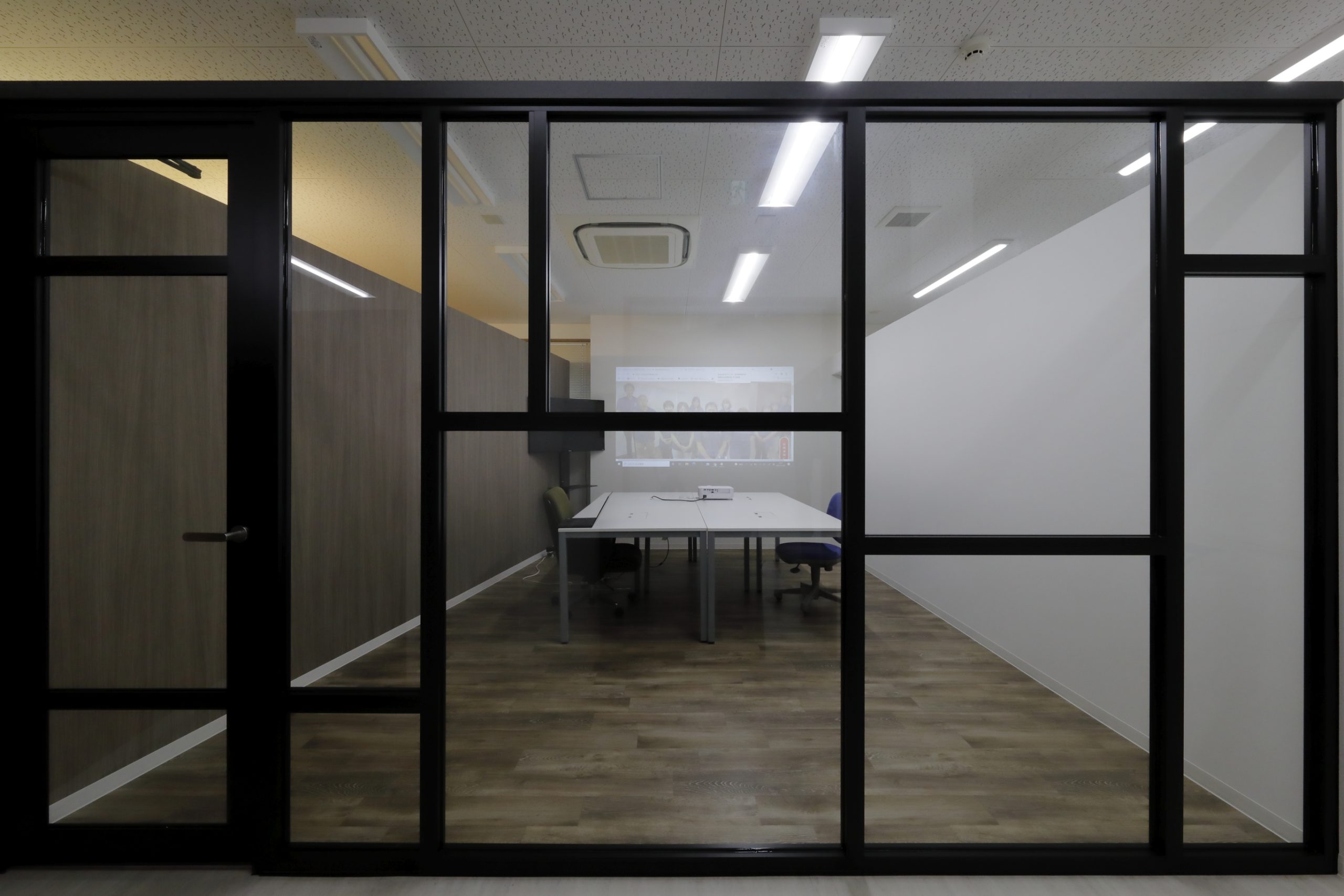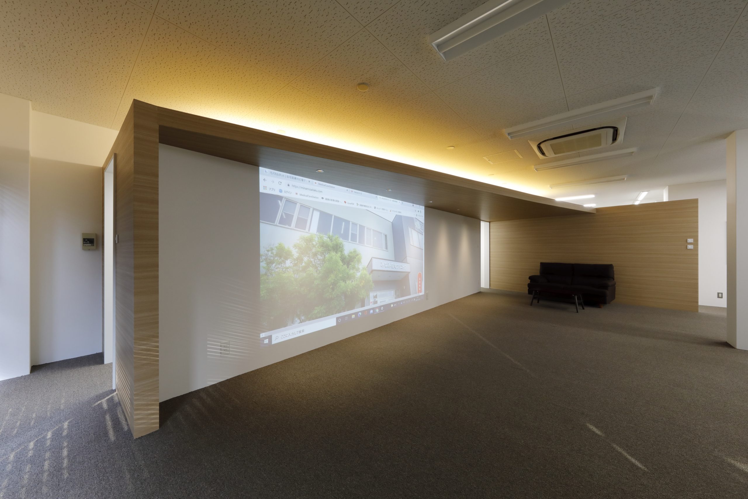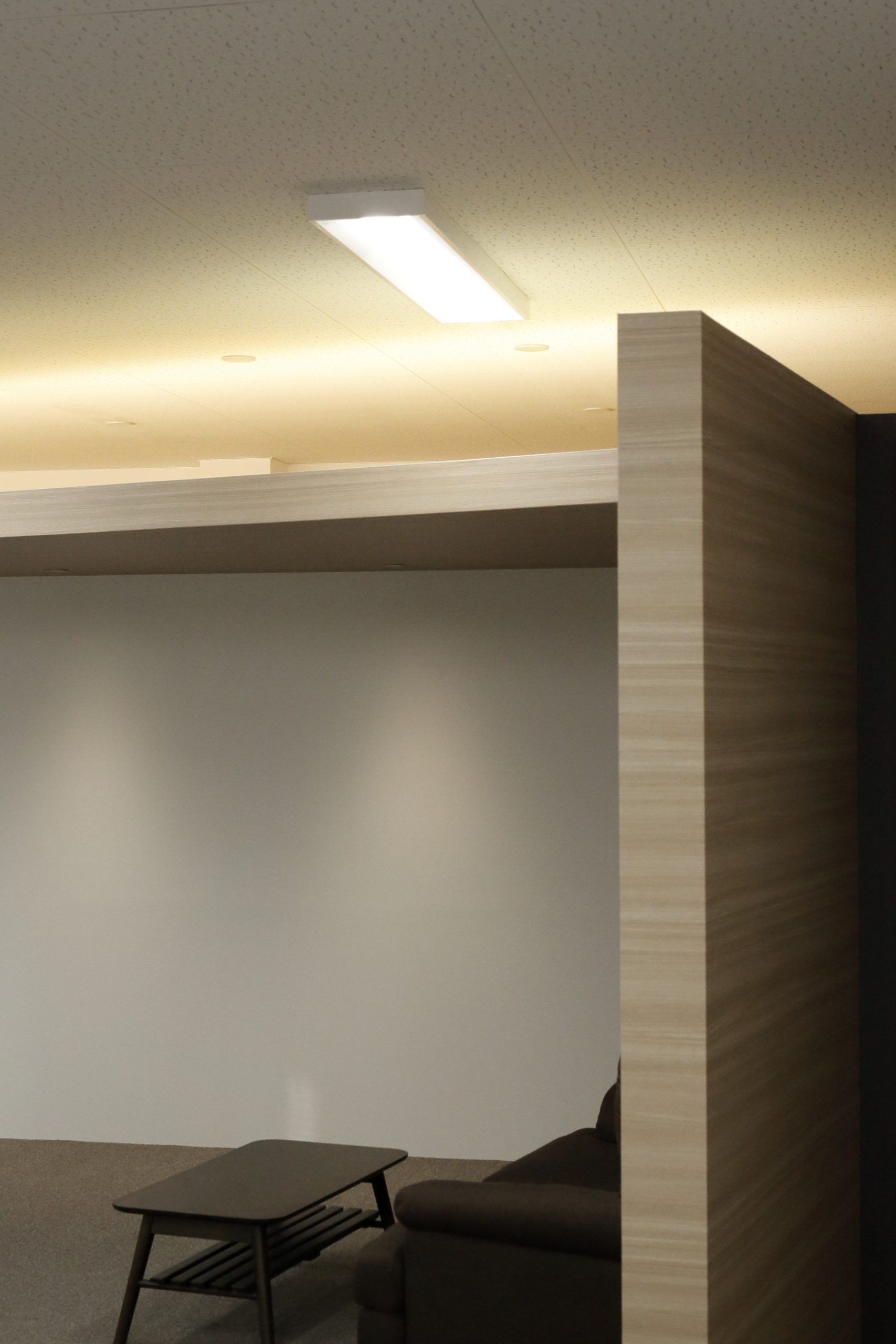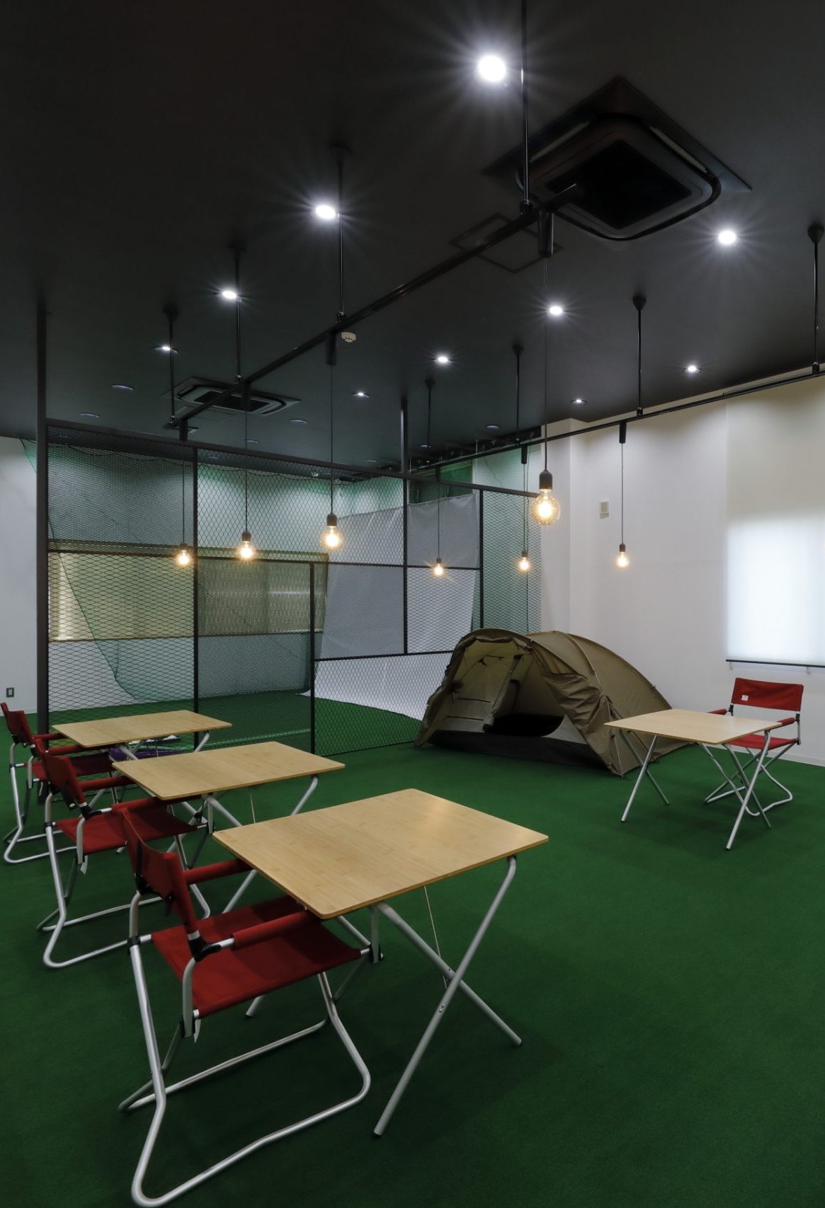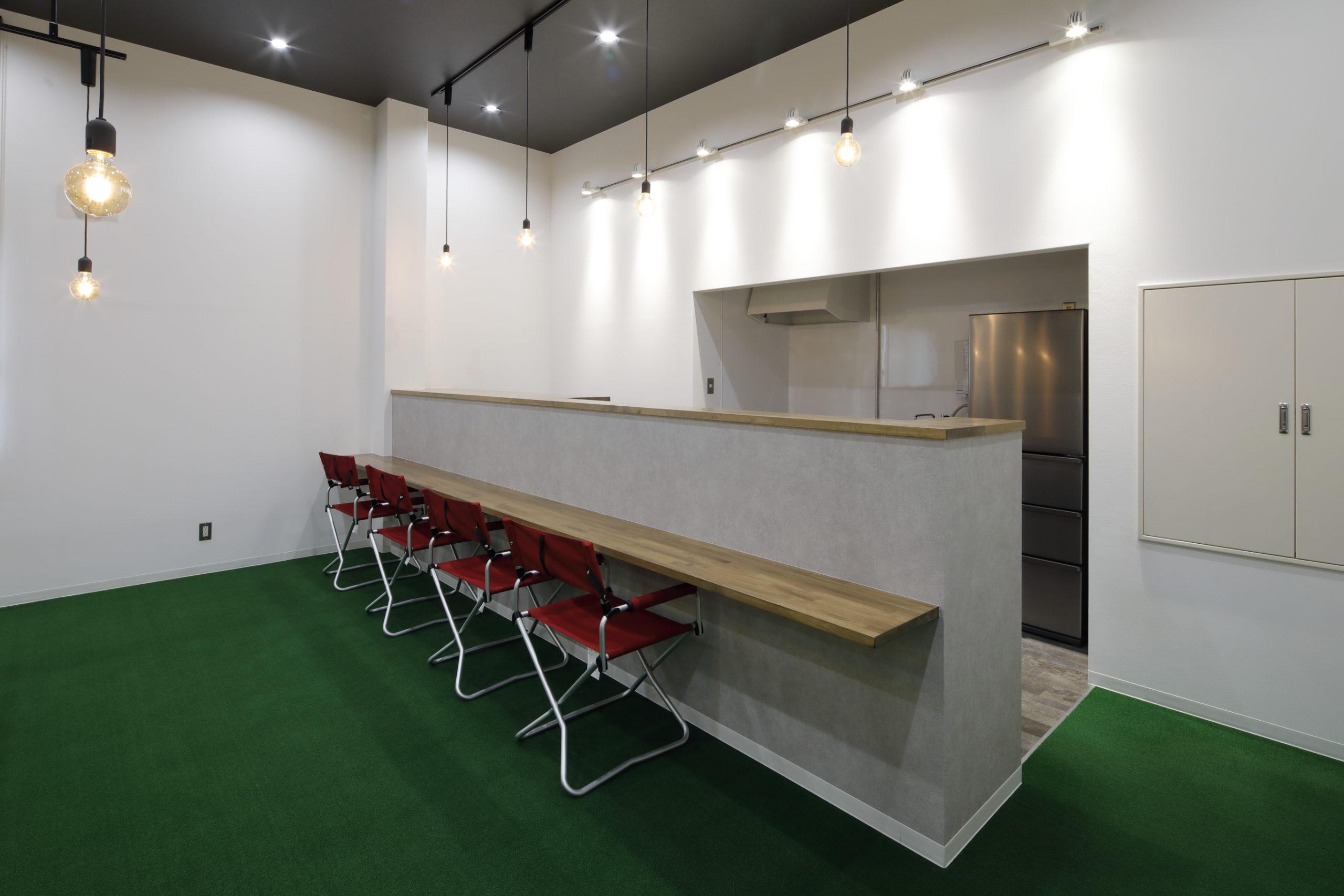 天井が高く広い旧スタジオは人工芝を敷いて屋外をイメージしたリフレッシュルームに。オフィスは既存天井を残したまま間仕切り壁を追加、間接照明を追加してメリハリのある空間としました。